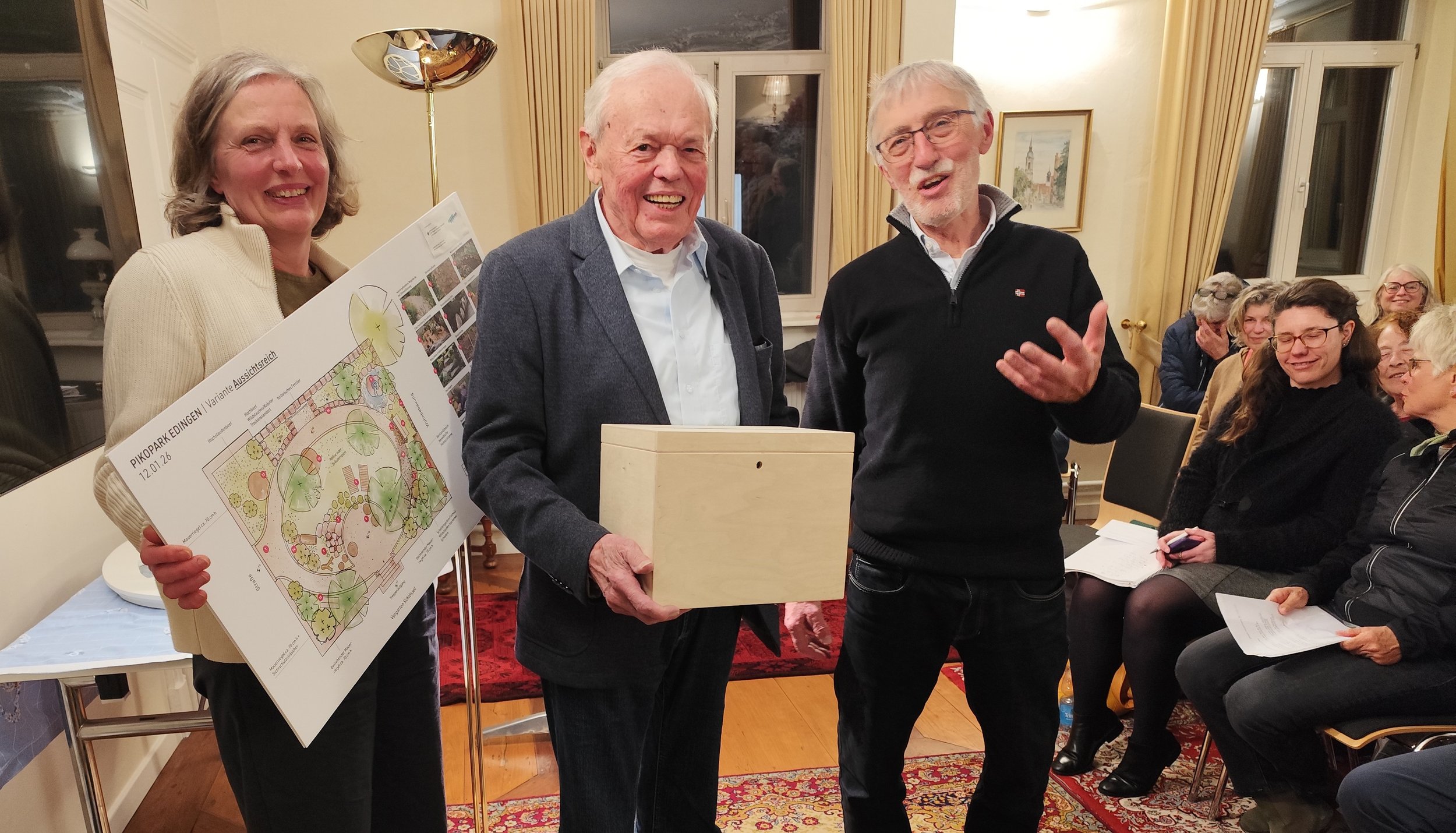 „Dafür bekommen die Bürger am Ort, insbesondere das historisch interessante Edinger Oberdorf, einen kleinen Park (Piko ist abgeleitet vom italienischen „piccolo“, sprich klein), der auf kompakter Fläche von 302 Quadratmetern sowohl die Biodiversität als auch das Miteinander fördert. ‚An die Fördergelder sind Kriterien geknüpft`, erklärte Heike Vetter. Mindestens 80 Prozent der Fläche müssen unversiegelt sein, Barrierefreiheit muss zeitlich und räumlich gewährleistet werden. Pflanzen sollen Vögel und Insekten anlocken. Geplant sind Wildstauden, eine kleine Wasserstelle mit Quellstein, Schattenplätze, eine Wiese mit Liegen, Totoholzbereiche und von vorne her eine minimale Treppe, die zu einem Platz von circa fünf Metern Durchmesser führt. Heike Vetter stellte die einzelnen Stationen im Rundgang durch den Piko-Park vor. ‚Dieser Park soll leben‘, meinte sie. Mit der abschnittsweisen Umsetzung des Entwurfs ist Landschaftsgärtner Aleander Jung beauftragt. Vor Juni werde er nicht starten können, sagte Hans Stahl. Der dann noch eine erfreuliche Überraschung parat hatte. Altgemeinderat und Ehrenringträger Georg Kohler hatte jüngst seinen 90. Geburtstag gefeiert und dabei um Spenden für das Projekt Piko-Park gebeten. Den dabei erzielten Betrag von 890 Euro hatte er auf 1000 Euro aufgestockt. An Hans Stahl übergab er nun den Schlüssel für die Spendenbox. Einige Fragen gab es nach Vetters Vorstellung, und Roland Kettner eröffnete den Reigen an Befürchtungen vor Vandalismus. Denn eigentlich sollte Kurt Geißlers Meisterstück – der Glasermeister war Miteigentümer des Schlösschens – im Park ausgestellt werden. Einige Mitglieder waren dagegen. Wünsche nach Licht und einem Pavillon wurden geäußert. Manches wird sich nach den Förderrichtlinien und anderes nach dem finanziell Machbaren richten müssen.“